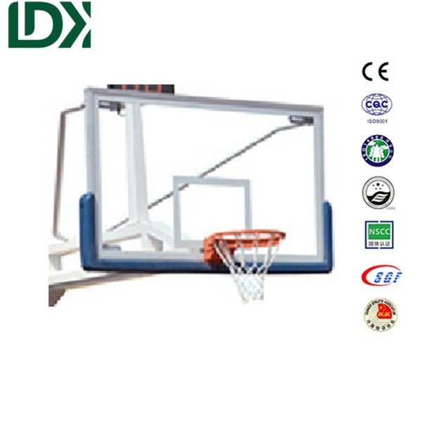 Backboard: 1800x1050x12mm certified safety tempered glass with aluminum protective frame. Features international standard polyurethane padding (50mm thick for bottom, 20mm thick for sides).