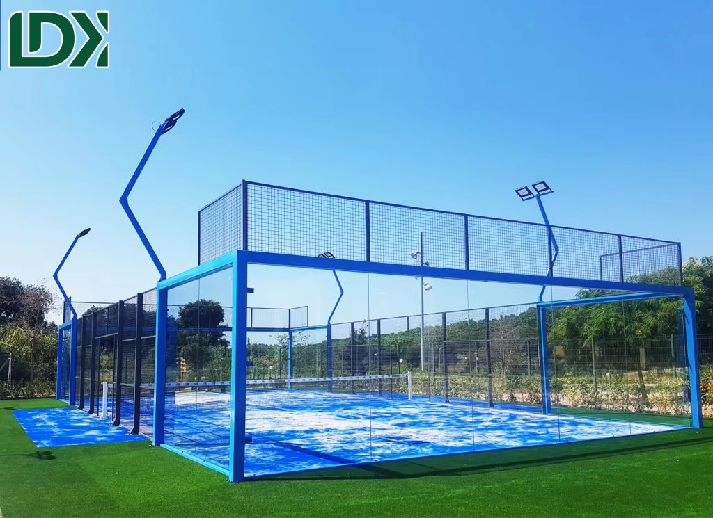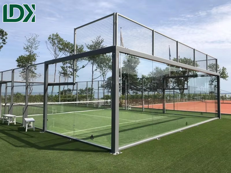 The LDK2019-3D Padel Court features a standard 20m x 10m field size (customizable) with 12mm high-quality tempered glass and durable 1×2 steel mesh construction for professional play.