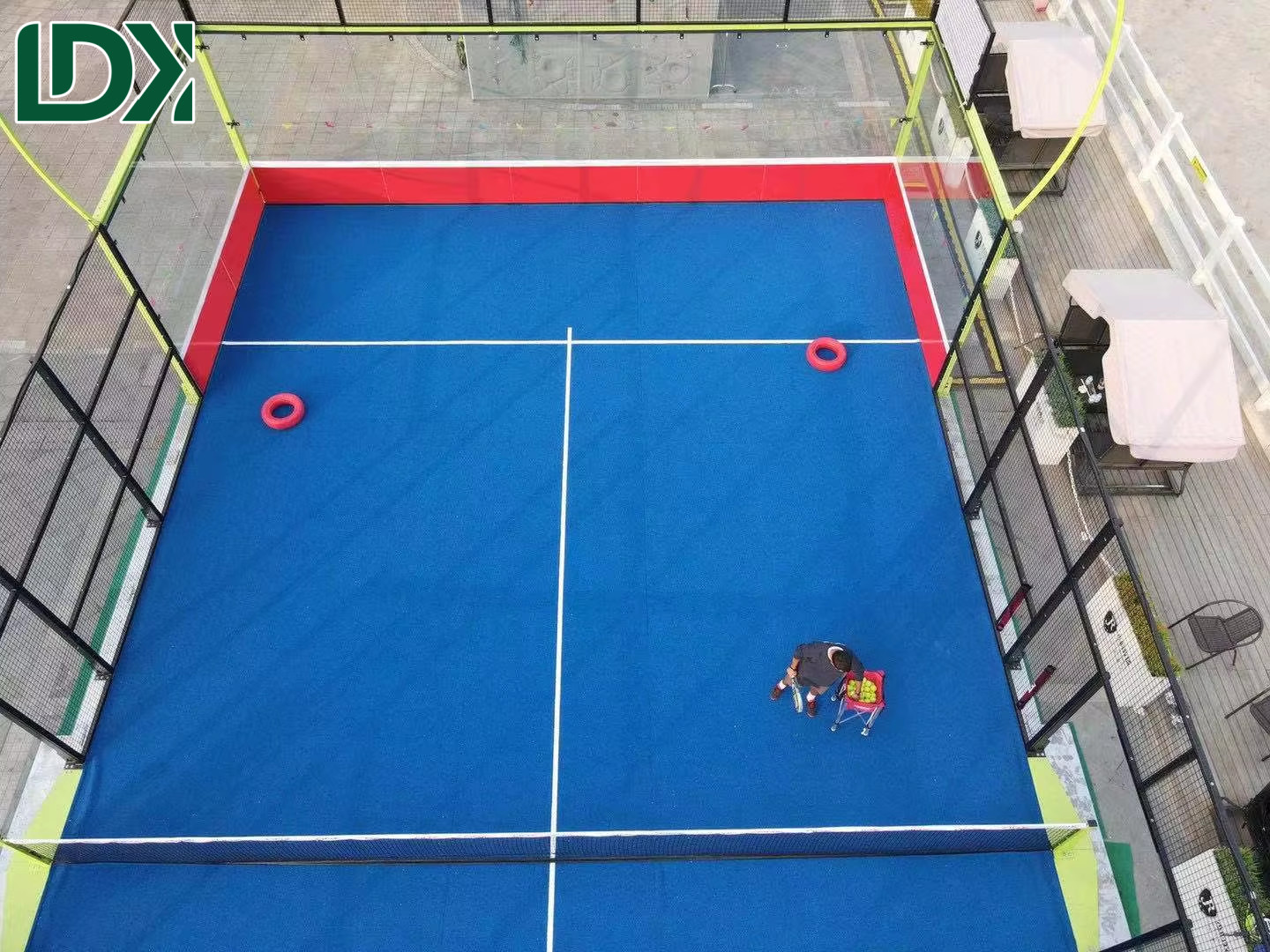 The LDK High Quality Padel Court (Model LDKBT01) features a 20x10m customizable field with 12mm explosion-proof glass and artificial turf support, complete with lighting. The carbon fiber-grip padel racket (340-380g, 455-460mm) offers a wooden frame, polyester net, and versatile specs designed for all players.