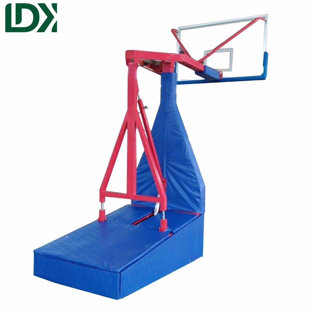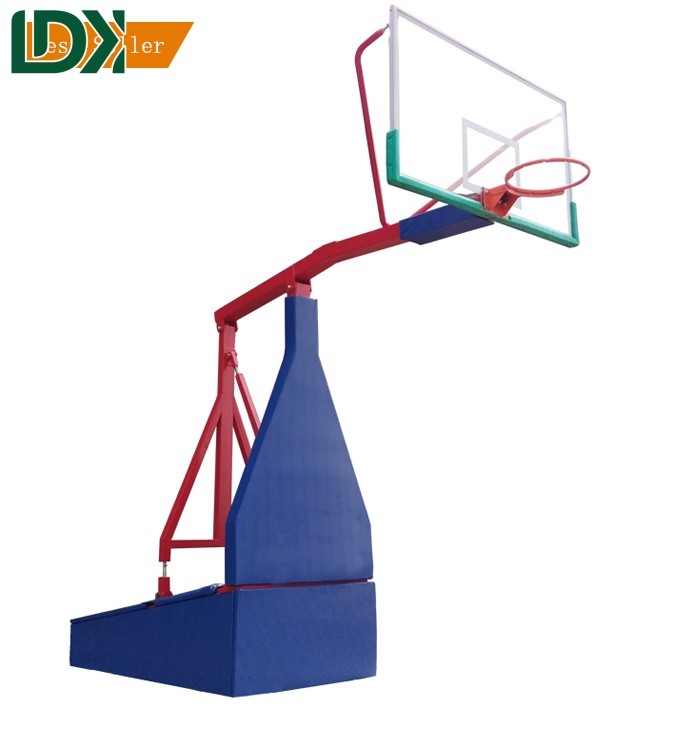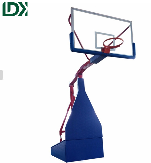 The LDK10012 basketball hoop system features adjustable height (2.44m-3.05m) with three fold system options: Electric Hydraulic, Manual Hydraulic, and Spring Assisted. The sturdy 2×1.26m base is constructed from high-grade steel with 360kg balance weights for exceptional stability.